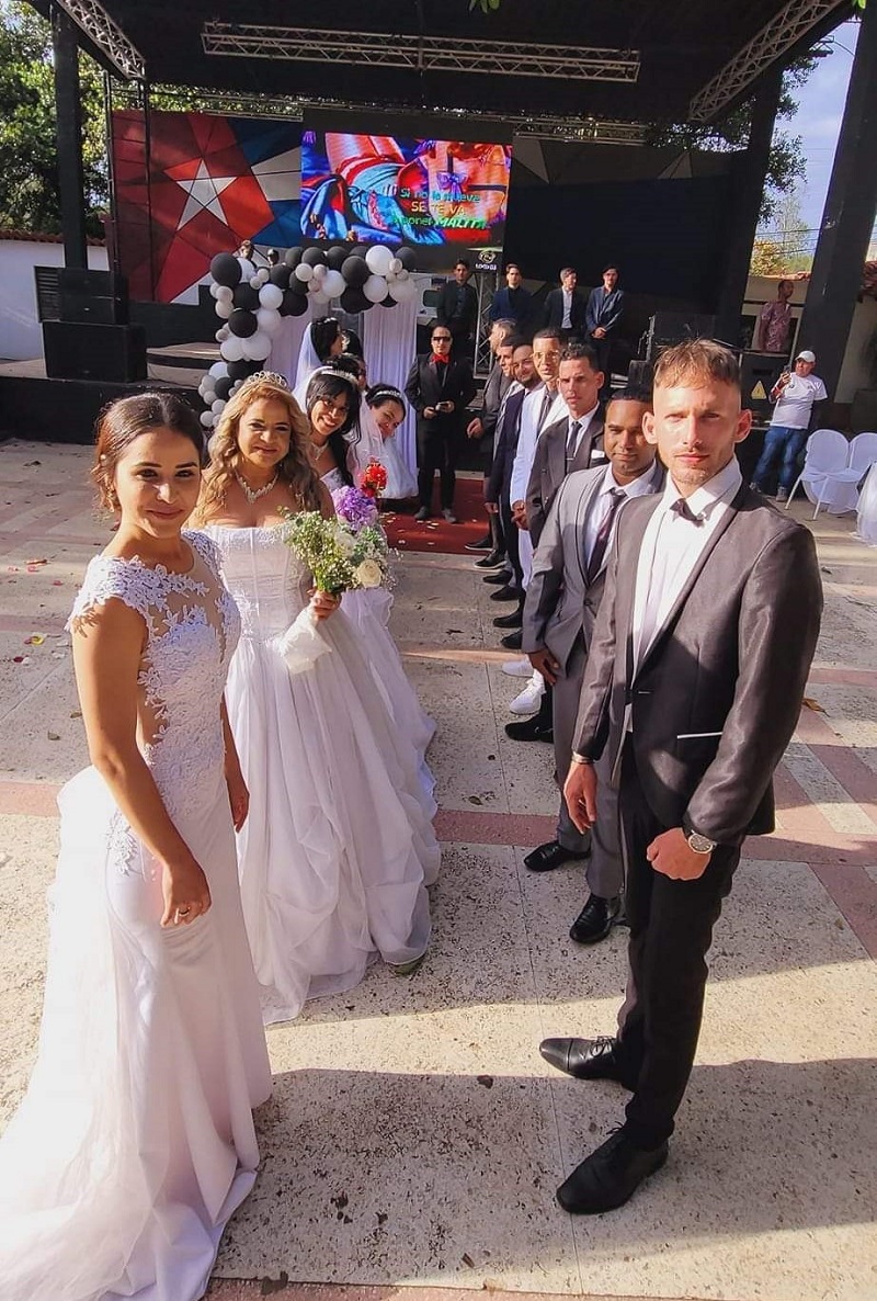 El Ave María de Schubert en las voz de los cuatro tenores cubanos, Habana Boys, marcó la entrada de las novias al recinto siendo recibidas por los 7 novios (2), iniciándose así la ceremonia matrimonial. Cada paso fue concebido al detalle, los más pequeñines esparciendo pétalos de rosas, la aceptación de uno al otro, el intercambio de los anillos, el brindis con las copas en las manos entrelazadas, que fueron secundados por los aplausos de centenares de personas entre familiares y amigos.