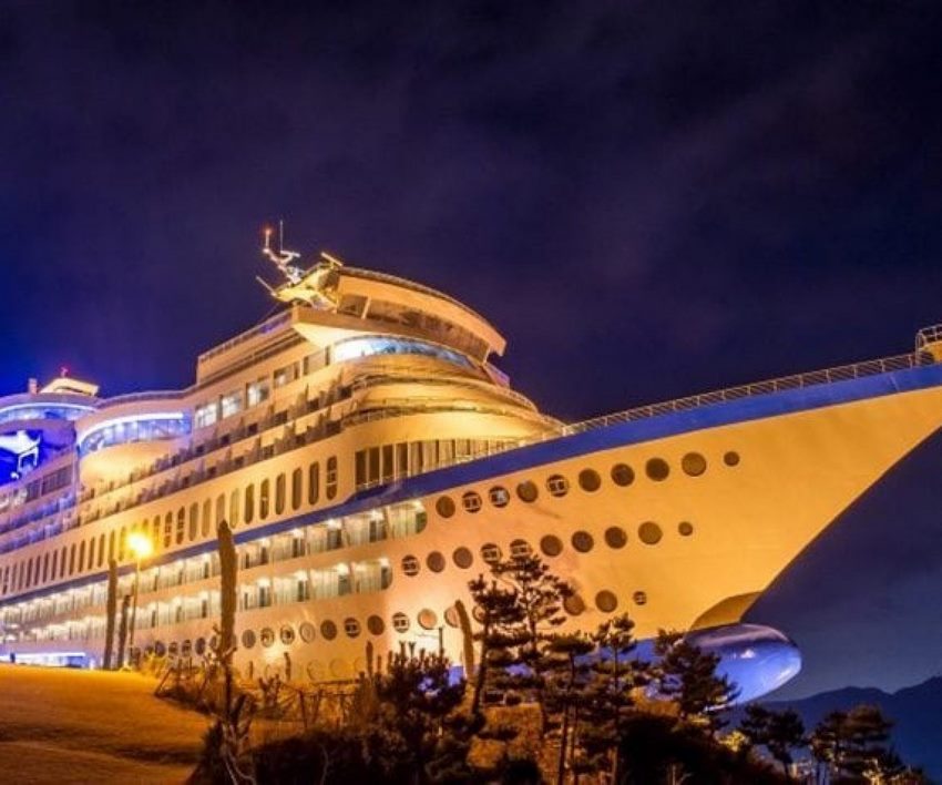 Esta es la singular propuesta que nos trae Sun Cruise Resort Yacht en la localidad turística de Jeongdongjin, en la costa este de Corea del Sur. ¡Un crucero encallado!, claro que no. Su historia es otra. Una idea bien original: un hotel temático. Se construyó en el año 2002 en un astillero y se colocó en la cima de un acantilado a 60 m del suelo. El trasatlántico está proa al mar, listo para zarpar, pero no suelta amarras.