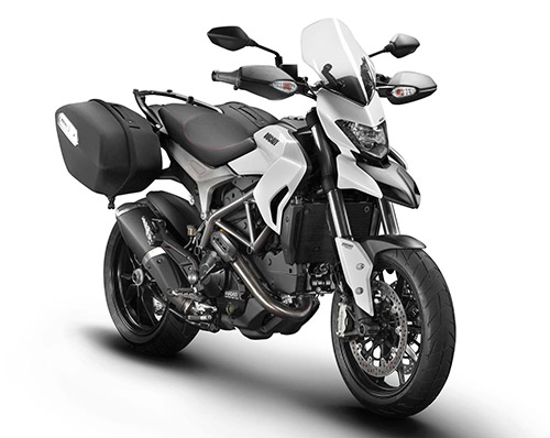 El concepto es original, porque esta nueva Ducati logra situarse entre el mundo motard y el de turismo con una especie de cross-over que hasta ahora no se había ensayado. Sus características de conducción son más relajantes y de serie viene equipada con una completa dotación touring que incluye maleteros laterales semirígidos desmontables de elegante diseño con una capacidad de 50 litros, asiento ancho y cómodo a solo 850mm de altura y manillares altos. El telescópico de horquilla invertida es el mismo que en la Hypermotard, pero la suspensión posterior presume de un monoamortiguador Sachs fácilmente regulable que permite un recorrido de 150mm a la rueda trasera.