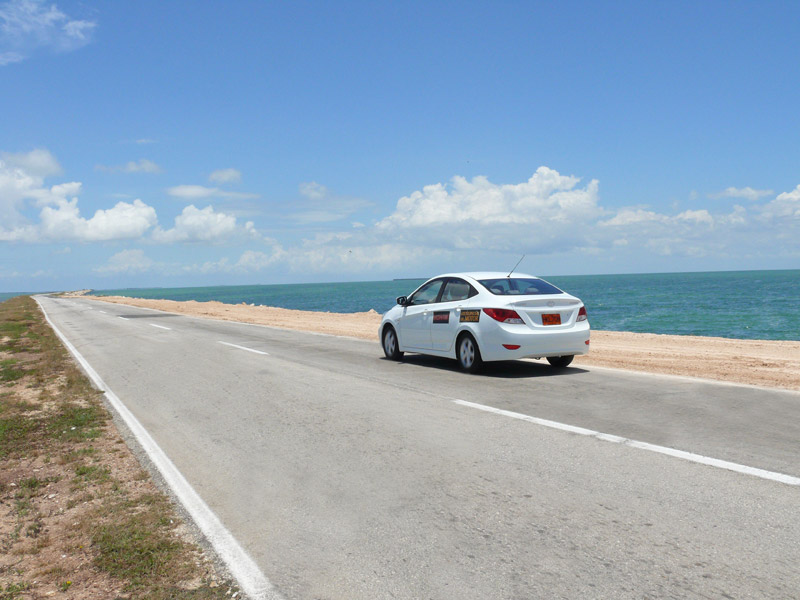 Es emocionante recorrer más de doce kilómetros en el Hyundai Accent 2011 por una carretera que se adentra en el Caribe, donde nuestro auto a prueba se deslizó cual velero sobre el mar. Sorprende, en medio del camino, una inmensa torre que anuncia que vas camino al archipiélago Jardines del Rey. En pocos minutos contactamos con Cayo Coco, la cuarta isla en dimensiones del archipiélago cubano. Desde allí, tomamos rumbo oeste para llegar a nuestro destino, Cayo Guillermo.