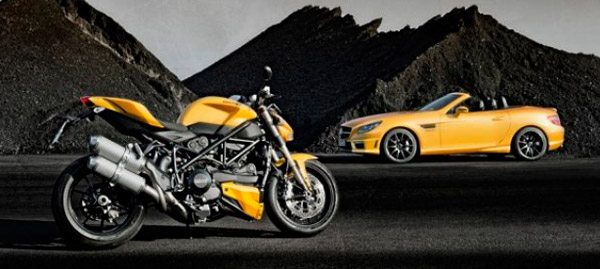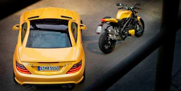 La colaboración iniciada entre Mercedes-AMG y Ducati ha llevado a dos ediciones especiales que han sido expuestas en el Salón de Bolonia 2011: el Mercedes SLK 55 AMG y la Ducati Streetfighter 848, ambos en un color amarillo 'streetfigther', que ha sido elaborado especialmente para la ocasión.