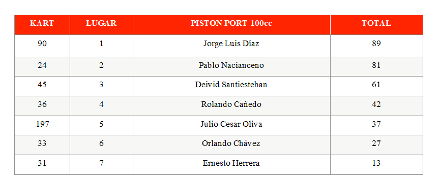 Al fin llega la hora de que el team 24 rompa el hechizo de salir del escalón plateado para trepar a la cima del podio, siendo esta su primera gran victoria de la temporada, donde ahora el favorito Jorge Luis Diaz “el pulga” como lo apodan mantiene la rienda de la Pistón Port con 89 unidades, quien debe apretar el pedal a fondo ya que solo restan 2 válidas para la final y el team 24 se le asoma con 81 cartones. El piloto local Deivid Santiesteban “el diablo 45” esta vez los acompaño para el 3er puesto, quien se mantenía firme en carrera, siendo buen rival pero presento problemas con sus neumáticos y solo logro mantenerse en la 3ra posición y se mantiene también en el escalón bronceado de la tabla con 61unidades, quien ahora le aventaja al experimentado Cañedo que esta vez su maquina 36 le fallo técnicamente.