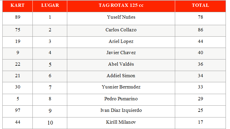 Para la categoría reina de este campeonato “TAG ROTAX 125 cc” categoría donde asiste la mayor cantidad de competidores esta vez el experimentado Carlos Collazo con su numero 75 de la barriada de Santos Suárez paseo a toda la grilla, ya que se desapareció de la fila con una gran ventaja por delante de todos los demás concursantes; el expirementado Collazo resurgírio, y se se siente confiado para arrebatarle el podio al piloto de MCV Comercial, Yuself Nuñez que acumula 90 unidades para el primer escalón de la tabla, donde esta vez Javier Chávez “Javielito” les acompaño para la medalla bronceada. Yusnier Bermudez, Ariel Lopez, Addiel Bermudez, el piloto local Ivan Diaz, y el piloto de la escudería DHL Pedro Pumarino fueron los restantes puestos quienes mantuvieron una ardua pela por los puestos.