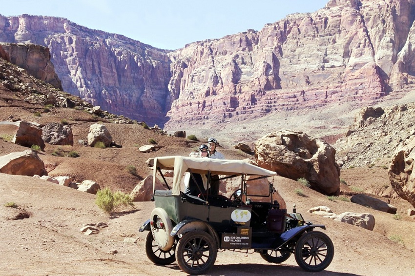 Este viaje alrededor del mundo, que comenzó en el año 2012 (sin apuros, aunque con decisión y constancia), se lleva a cabo, además, para apoyar diversos proyectos que impulsa la organización internacional SOS-Aldeas infantiles. Y lo hacen en un Ford porque es el automóvil de tradición en la familia de Dirk Regter, pues tanto su padre como su abuelo rodaban en sus tiempos con Ford.